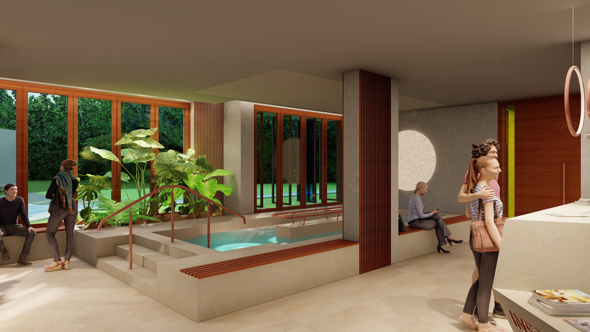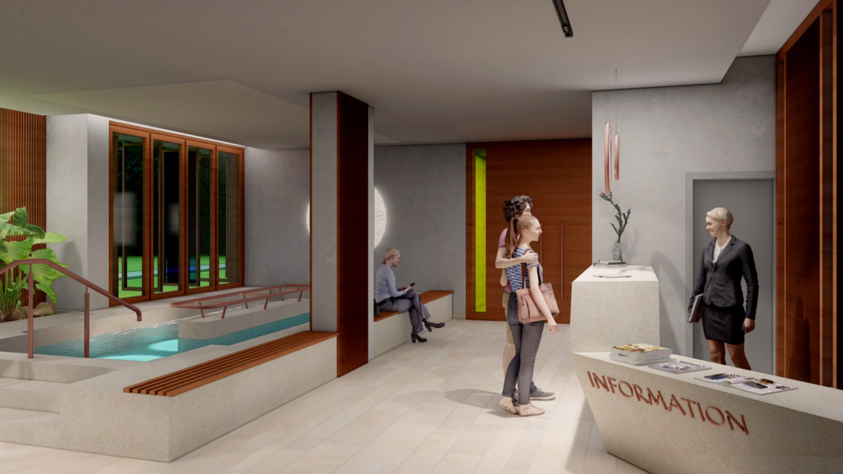 Der Neubau soll dadurch zwischen dem 1–2-geschossigen Baukörper des Freizeitbad Riff und dem viergeschossigen Baukörper des Riff Resort vermitteln.