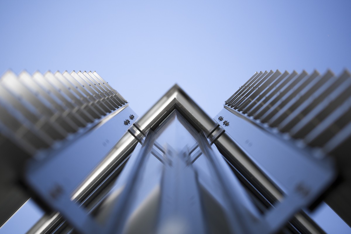 Die Architektur präsentiert sich in einer abgestuften Gebäudeform, die das Straßengefälle vor der Halle partiell aufgreift. Die Seitenwände sind unterbrochen von markanten Oberlichtbändern und verglasten Gebäude-Ecken, die den gesamten Baukörper kleinteiliger wirken lassen.